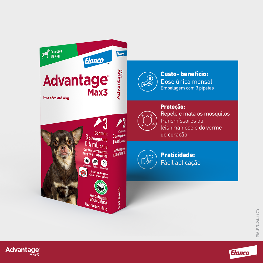 Advantage™ Max3 é um produto Elanco, líder global em saúde animal, pensando sempre em fornecer produtos e serviços para prevenir e tratar doenças em animais de estimação.