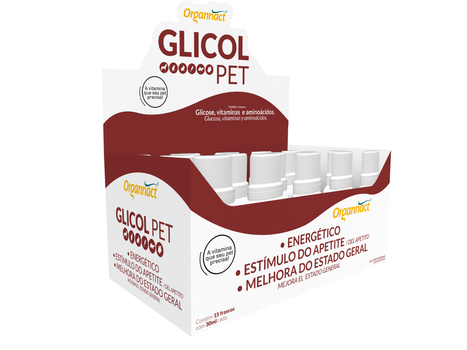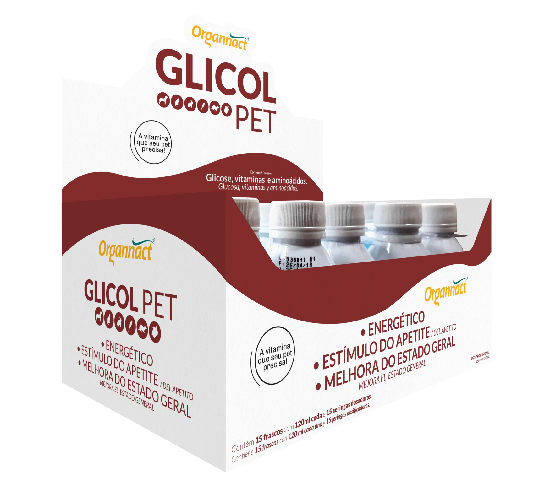 Display com 15 frascos de 120 ml e Display com 15 frascos de 30 ml. Líquido palatável em frascos com 120 ml e 30 ml.